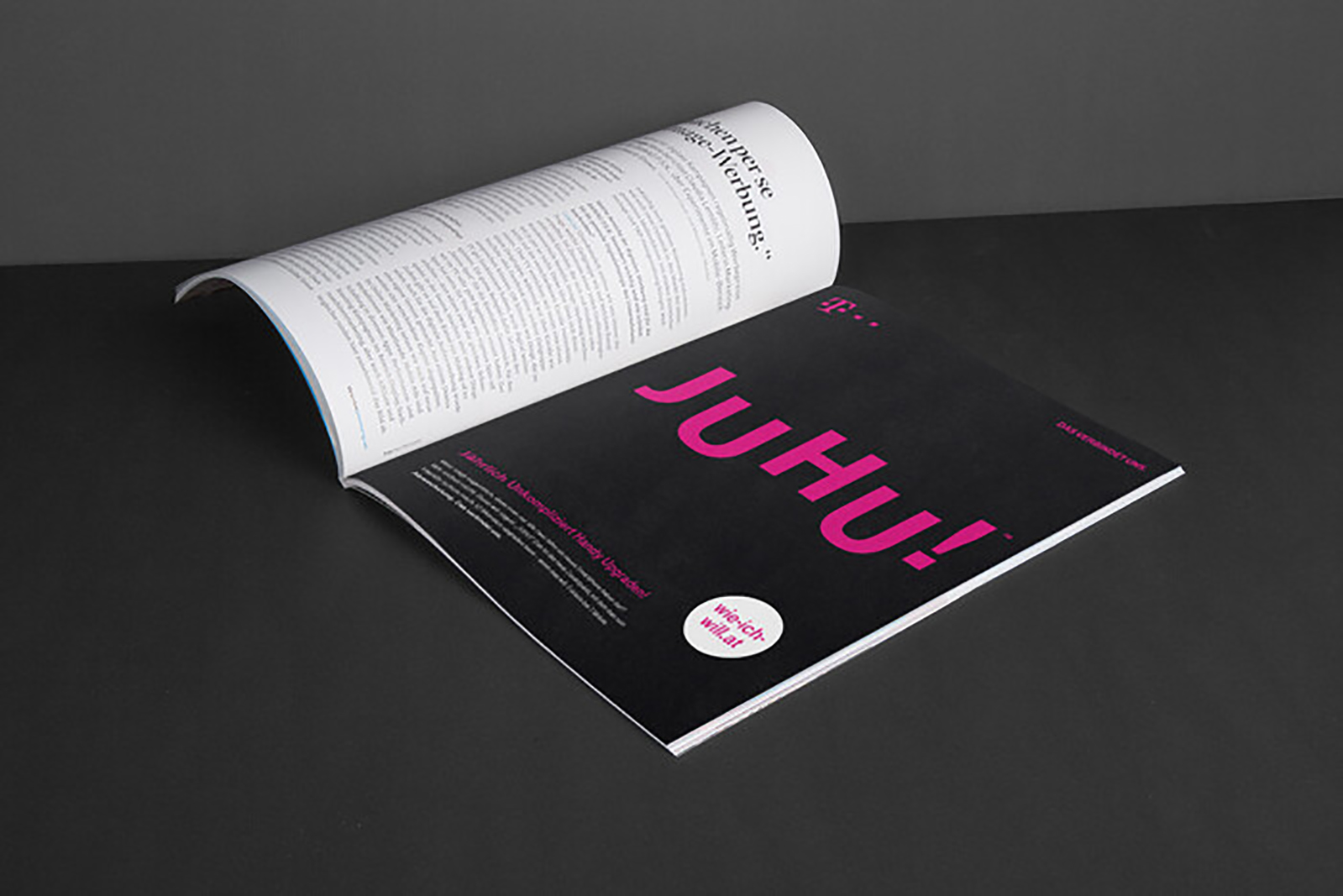 Volkmar designed the corporate design for T-Mobile Austria. It was distinctively different from the branding of German Telekom at the time. The focus was on black and white photography, always complemented by the signature color magenta. It was a resounding success and remained the independent branding of Telekom Austria for nearly 10 years. As part of that, the "JUHU" campaign was created for a product where customers could experience the thrill and excitement to celebrate when your phone breaks. You will simply get a new one. JUHU!